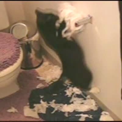 Gray ferret tears up a roll of toilet paper in the bathroom. It hangs from the roll by its teeth, looks like it's doing exercise pull ups. Pets.