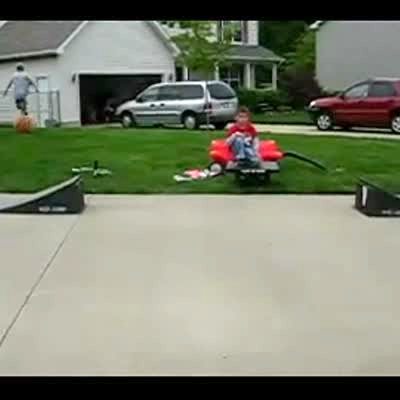 Teen boy jumps two small ramps on his bike, misses the second one and falls hard on the driveway. Short tails, no additional footage available - camera was turned off.