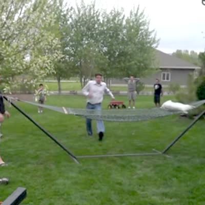 Additional footage for clip # 687467 [A man attempts to jump over an outdoor hammock but falls down]