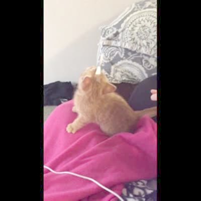 A kitten cat jumps off the back of a chair, falls short of the counter, and to the ground.