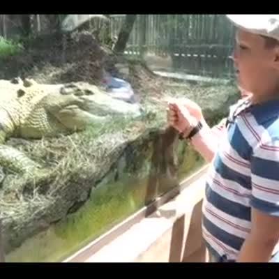 Two boys are checking out an alligator at zoo. They are knocking on the glass and making faces. Dad and sister come by and the alligator snaps at them.