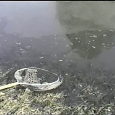 Man holds fishing net at the edge of the water / lake and a large fish jumps right into the net. Amazing.