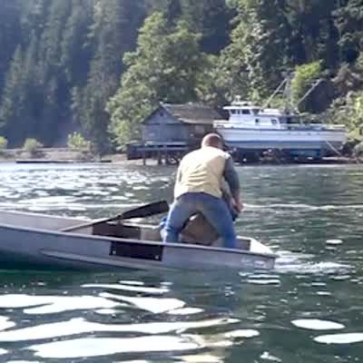 A boat with a family inside slowly drifts away from the dock. A man reaches his arm out to pull the boat back towards the dock but he falls into the water.