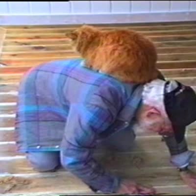 Cat sits on man's back while he refinishes porch. (2 angles)
