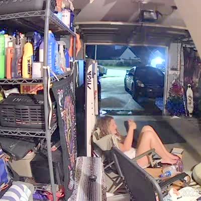 A young girl falls through the ceiling in a garage and lands on a teen girl who is sitting in a chair. Security Camera Footage