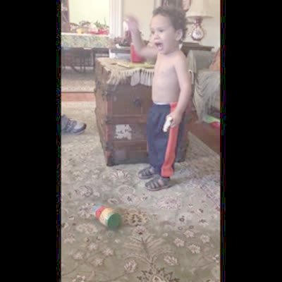 "Babbling Boy Boss" A tot boy babbles to his uncle and the man argues with the boy about the measurements the man is making. The have a fake argument although the little boy's babbling is not understandable. Cute
