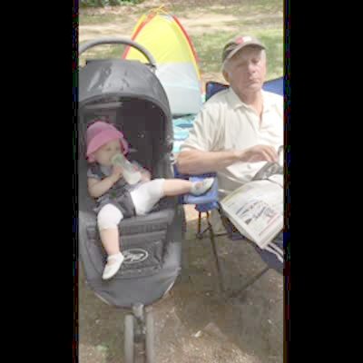 A baby girl sets her foot on the armrest of her grandfather sitting next to her. The senior man grabs her foot and sets it down off the armrest, but the granddaughter just puts it back up, over and over.