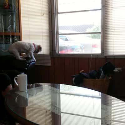 A dog sits on an armrest on a chair and watches a man as he eats, but each time the man looks at the dog, the dog looks away.