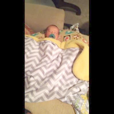 A baby boy indoors starts to wake up with his eyes rolled back after a girl calls to him.