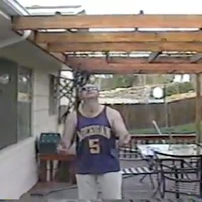 Man jumps up to hang on patio awning and the beam breaks, he falls and lays on the house deck. Bonehead. Set up.