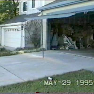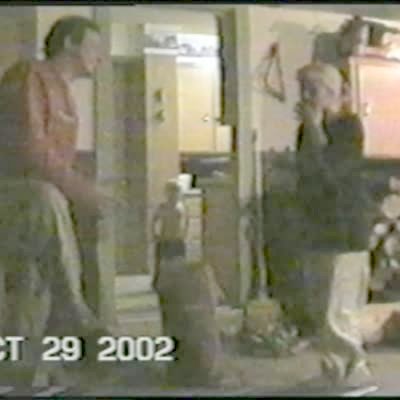 A young boy throws an axe at a target on a porch, but he misses and breaks a window. Security footage.