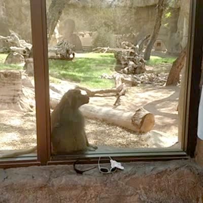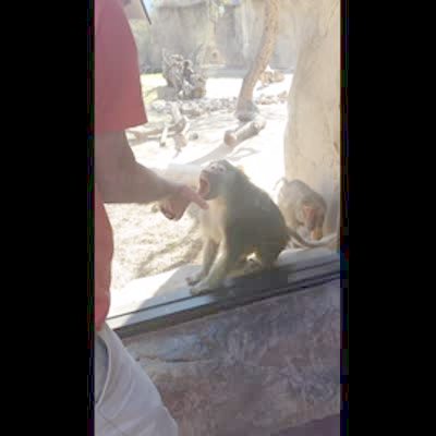 A man tries to pick up a pair of sunglasses that is in front of a baboon monkey exhibit but the baboon slaps the glass and floor to stop him.