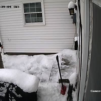 Security camera footage of a man who slips and falls on snow/ice on his back porch.