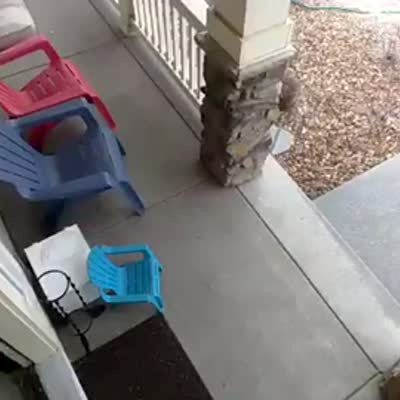 A grandmother and her teen grandson decorate a front porch for Spring, when they both scream and run back inside of a home when a bird or bat flies at them. Security footage.