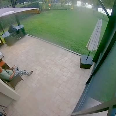 Security footage of a man that sits out on back porch while canopy rolls back in with water still on top of it. At the end the man gets soaked by water.