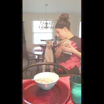 A woman holds a hedgehog while a dog jumps up high repeatedly in the background trying to get the hedgehog.