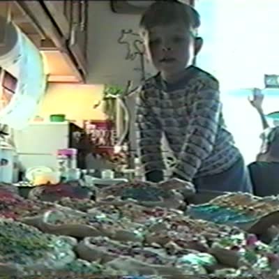 Mom films cookies she made with her sons, 1 boy falls off the table / stool & hits the floor hard. Short tail.
