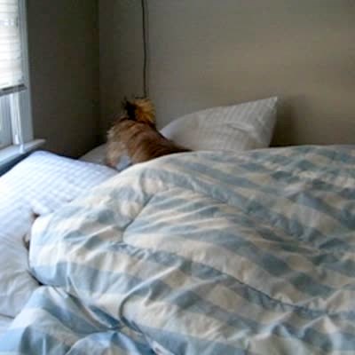Small brown dog attacks woman's feet under a blanket. She accidentally flips the dog off the bed and out of frame.