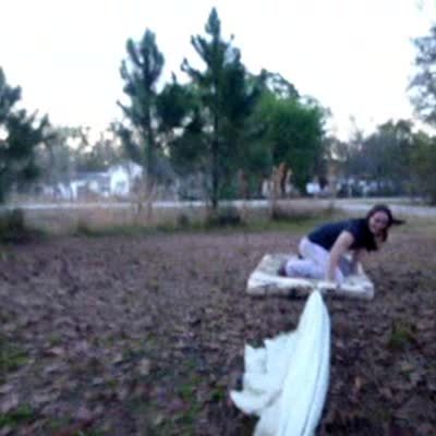 Woman rides on a mattress and gets pulled behind an offscreen car. They're tied together by a bedsheet. Long for edit. Blurry. Music plays over clip.