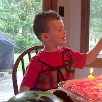 A family sings "Happy Birthday" to a young boy at home, then he says "I wish I had a better cake" before he blows out his candles.