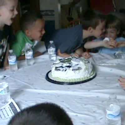 At a boy's birthday party, his friend blows out the candles just before he can and when he wrestles him for it, a hand comes up from under the cake and scares the party of boys indoors.