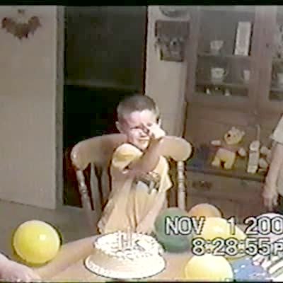 A 7 year old boy is surprised with a birthday party. He falls on his butt at 0:14.