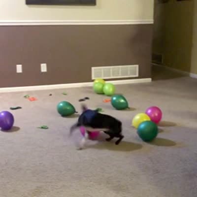 A dog runs around the living room and pops every balloon one at a time
