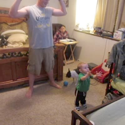 "GROIN BITTER" A tot baby boy waves his hands around while trying to play with an Xbox kinect game with a man indoors. A Boston Terrier dog jumps up and bites the man in the groin.