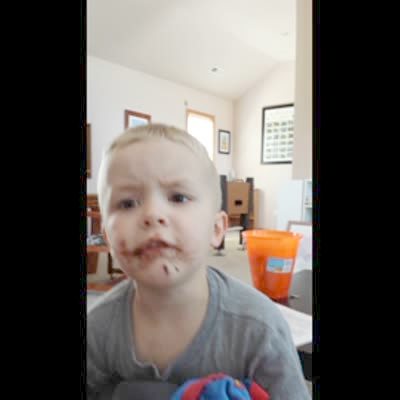 A tot boy with frosting on his face blames his tot brother and says that some of the frosting fell on his face. His dad asks the brother of he did in fact eat the cupcake and the boy says yes.