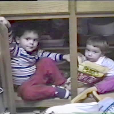 2 tots make mess in kitchen, hide in cabinet. Tot blames brother, says "Billy did it." Billy opens cupboard door & agrees. Cute.