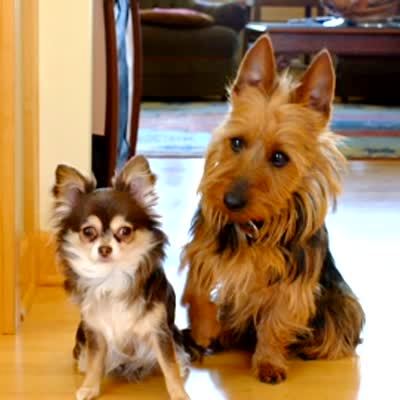A dog paws a small chihuahua dog when asked who pooped in the kitchen.