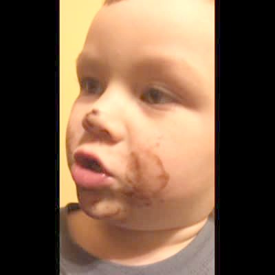 A tot boy with chocolate all over his face tells his mother it's water before he blames his dog for the mess.