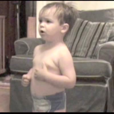 Tot boy in diapers sings "God Bless America" in the living room while watching a baseball game. He says "I need a microphone" to dad. Long for edit.
