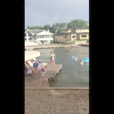 A young boy falls and goes into the water as he runs to the lake yelling God bless America.