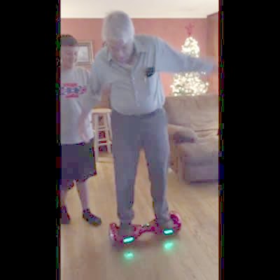 A senior man rides a hoverboard for the first time and falls on his back in the living room.