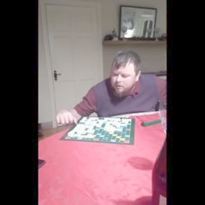 Man playing scrabble gets angry and tosses the board game over, spilling the tiles everywhere.