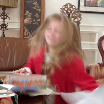 Four young girls and a tot girl on a porch attempt to return a board game to their neighbor. A woman talks to them through the doorbell security camera and tells them to leave it on the porch. A young girl leaves it on the floor and as they walk away the tot girl picks it up and runs away with it. Doorbell security camera.