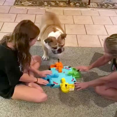 A bulldog dog paws at a game board as a woman and her daughter play Hungry Hungry Hippos in a living room.