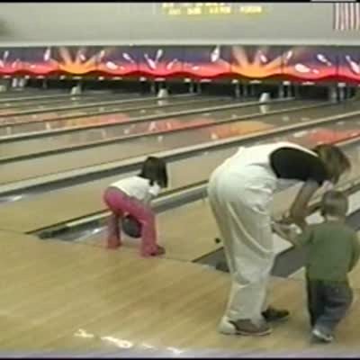 Tot rolls bowling ball, runs after it, mom chases, falls on lane.