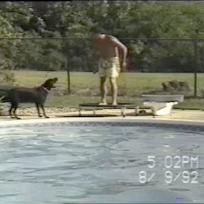 Trampoline Bozo. Man bounces on trampoline near pool and falls in.