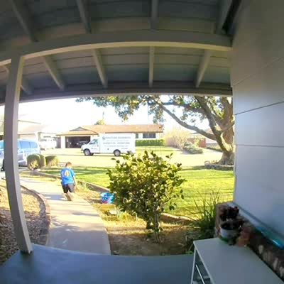 A young boy throws rocks in a yard until he shatters a car window in his driveway, then screams as he runs to his front door. Home security footage.