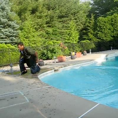 "Four Square Falling" Man playing 4 square falls into a pool while chasing the ball. Camera loses focus.