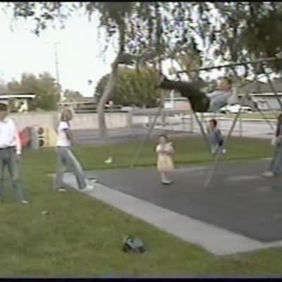 Man on playground swing drags legs on ground, flips out of swing, falls onto the pavement on his front. Little recovery. Bonehead.