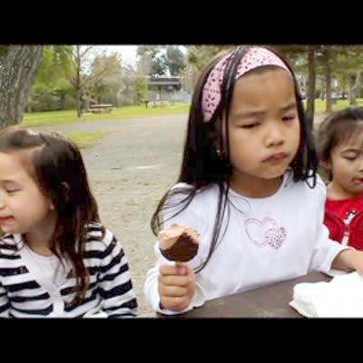 "Diabetes Dad" Three young girls eat ice cream bars at park. One brags that her dad has a gold tooth, other girl says her dad has diabetes. Kids say.