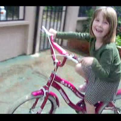 Little girl rides bike around in circles, bragging about not needing training wheels. Then she crashes into little brother, hitting his head. She falls over.