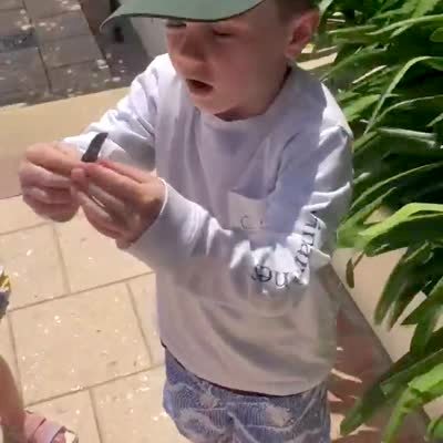 A young boy brags that he caught a lizard with his bare hands. Then it bites him and he drops it and screams "ahhh it bites!" on the sidewalk.