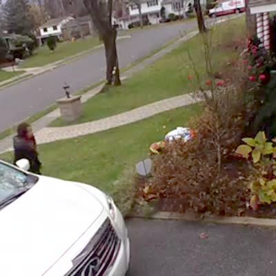 A woman gets out of her car and walks to a front door. Her car rolls backwards down the driveway and she runs off camera to catch it. No audio.
