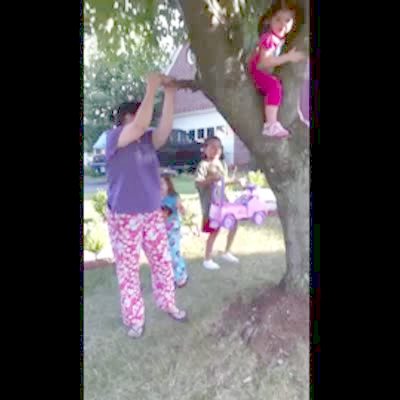 A teen girl climbs a tree outdoors and hangs from one of the branches. Her older sister walks behind her as the climbing girl says "It's gonna break" and asks her sister "You gonna catch me?" before the branch breaks and she screams as she falls to the ground.