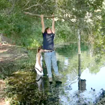 Man hangs on tree branch over pond & it breaks over the water, he falls in.