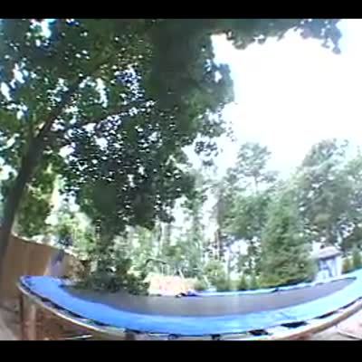 Teen boy jumps on trampoline & grabs tree branch. It breaks & he falls off. Fish-eye lens